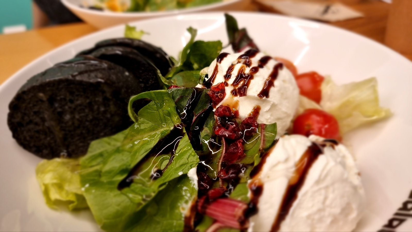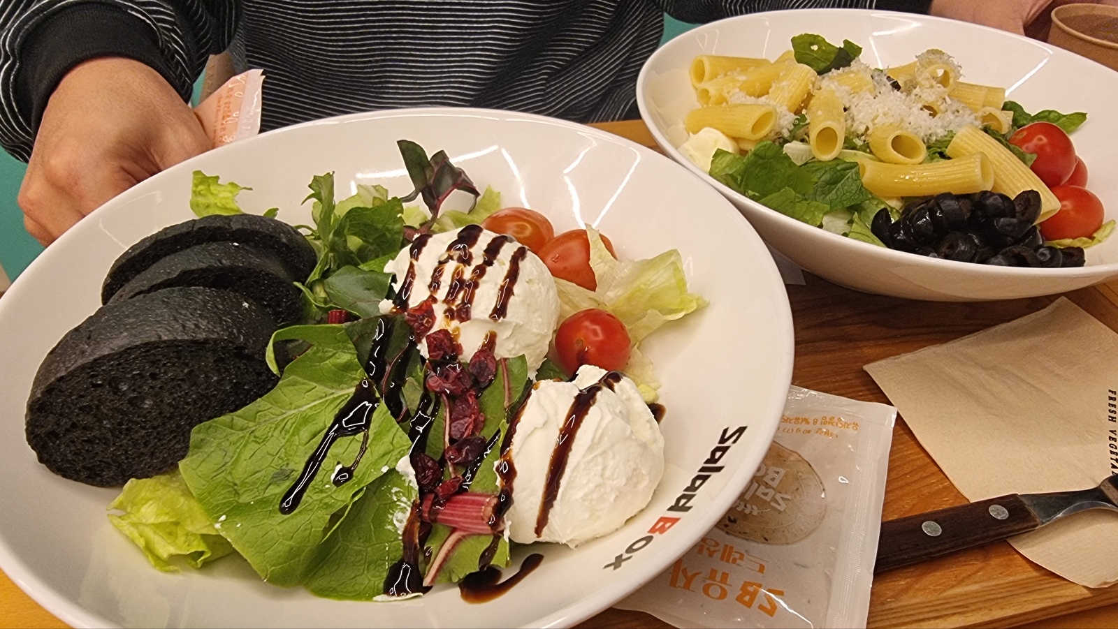 오징어 먹물 브래드는 딱 피트입니다!ㅋㅋ 한 포크 찝어서 샐러드를 먹기 시작하면, 소가 여물을 씹어 올리듯 계속 계속 손이 가는 맛입니다. 저도 올드한 세대로부터 사상주입교육(?)을 받아온 세대라, 샐러드가 밥이 된다고? 주의가 있었지만, 샐러드 박스를 다니면서 부터는 생각이 싹~ 초기화되었습니다.