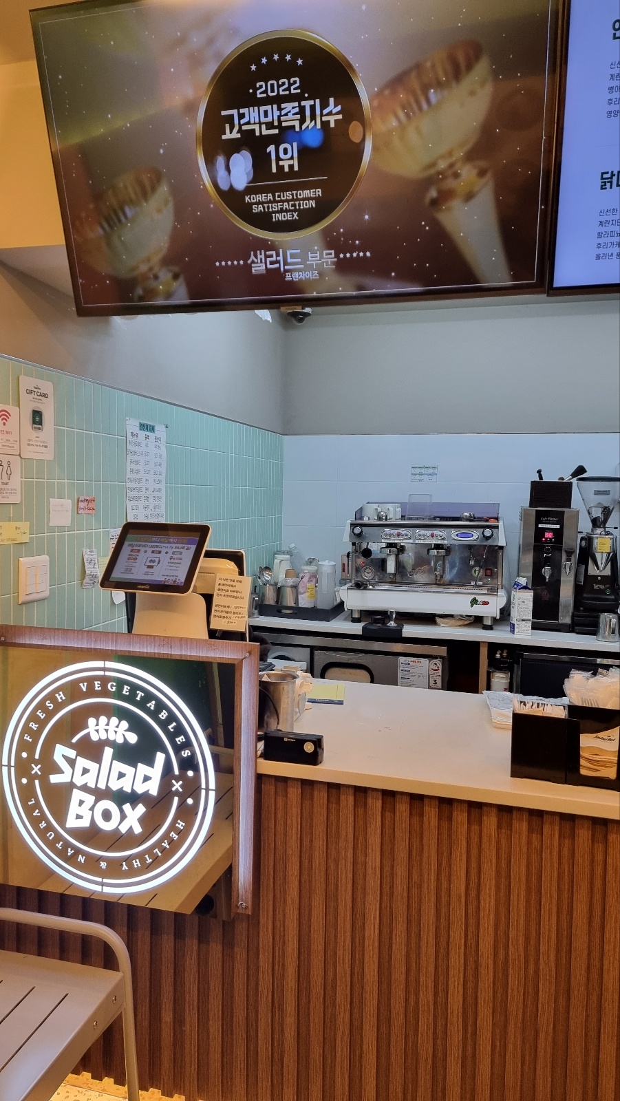Salad Box라는 간판이 깔끔하게 샐러드바의 아이덴티티를 보여주는 모습. 시원한 윈도우 안에서 샐러드를 먹고 있는 사람들을 보게 되면서 알게 된 곳입니다.