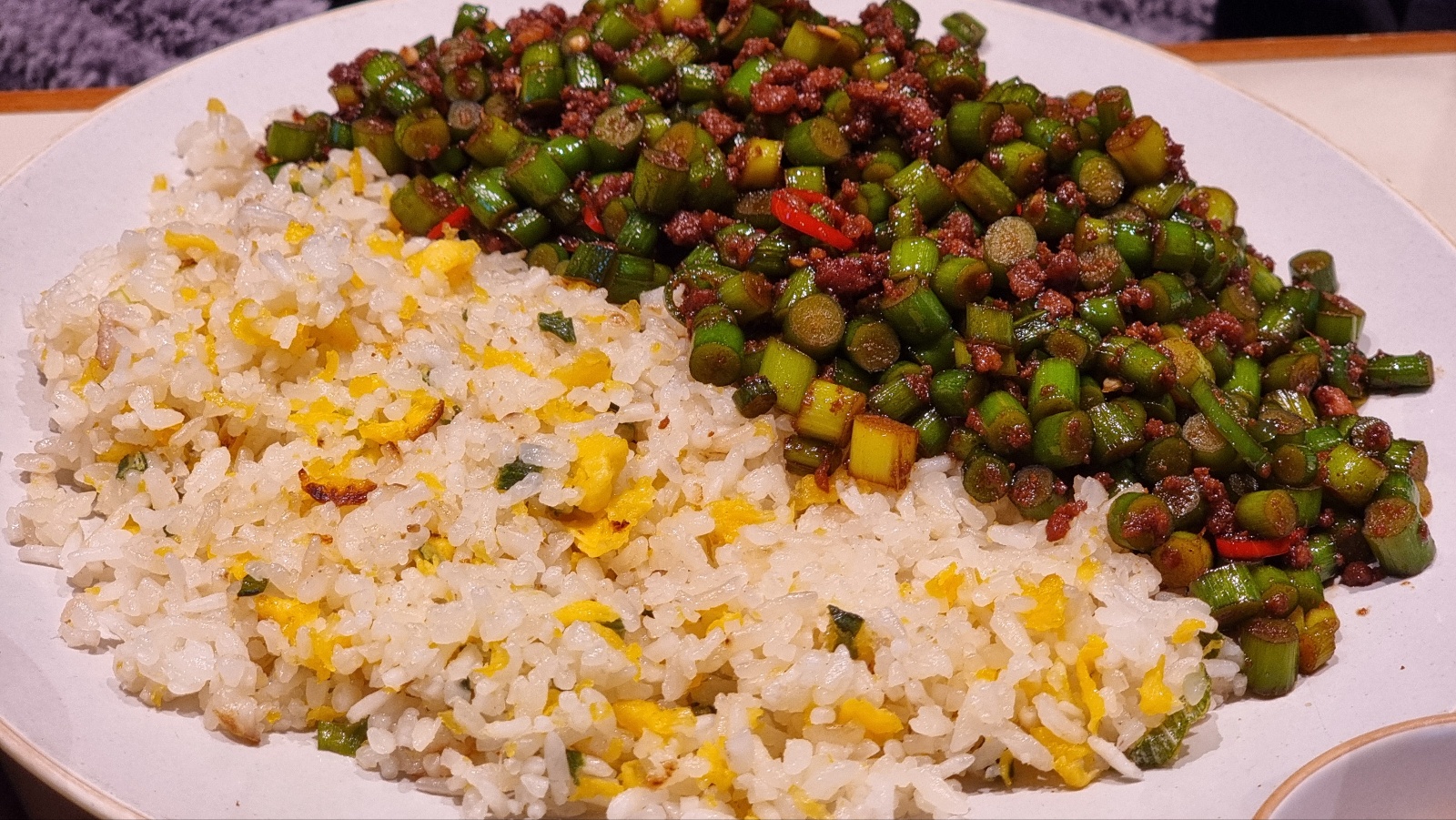 마늘쫑을 볶음밥에 어떻게 적용했을까 궁금해서 줌을 좀 땡겨봤습니다. 돼지고기를 갈아서 마늘쫑과 함께 볶았군요.