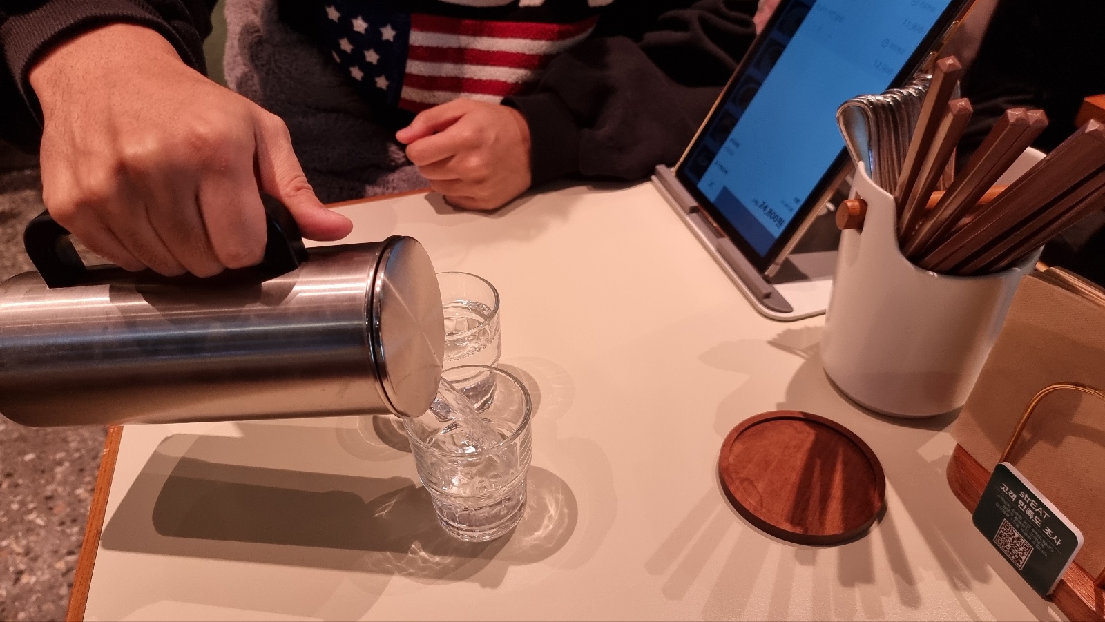 카페테리아형 식당이기 때문에, 밑반찬이 좌악~ 깔리는 스타일은 아닙니다. 분식점처럼 밑반찬은 본품과 함께 사이드로 약간 나오는 형태. 일단 물을 따라봅니다.