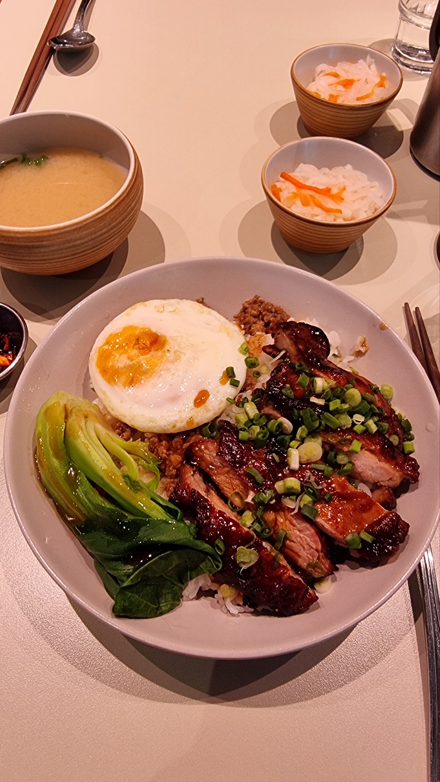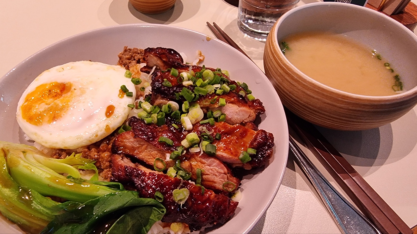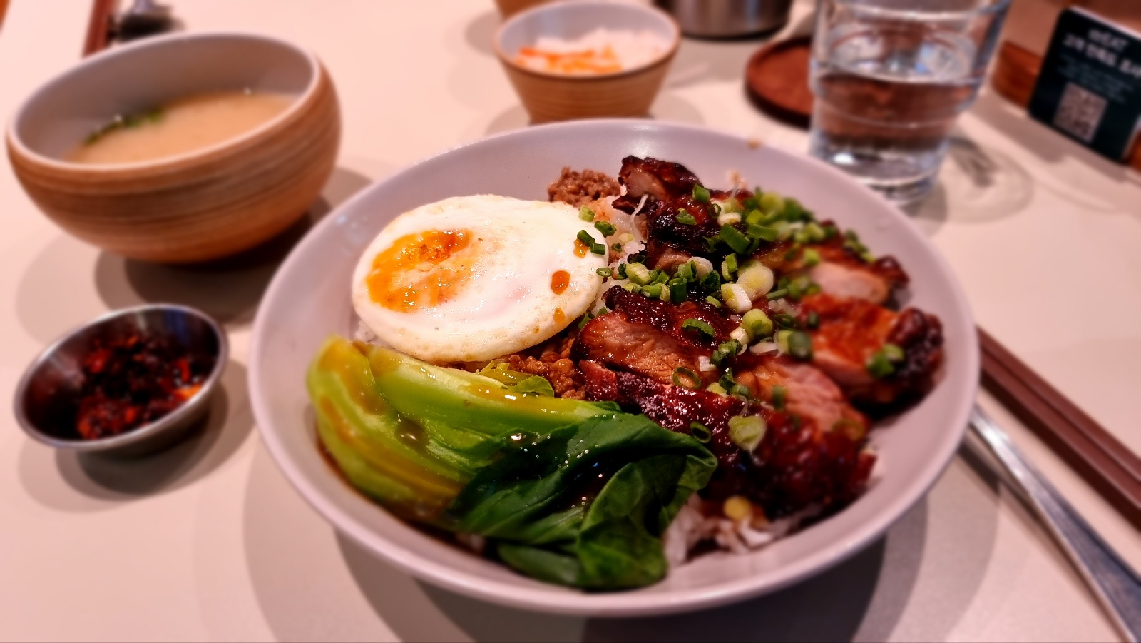 주문 후 잠시 뒤 서빙된 홍콩식 치킨 덥밥입니다. 청경채가 절반 정도 통째로 아주 비주얼이 좋습니다.