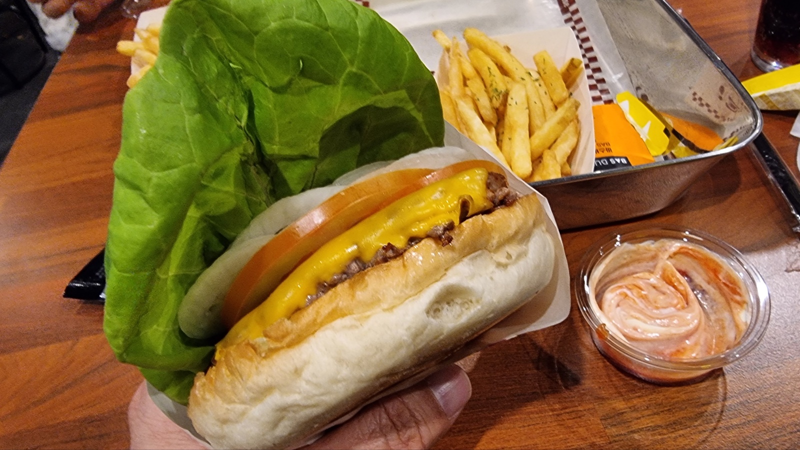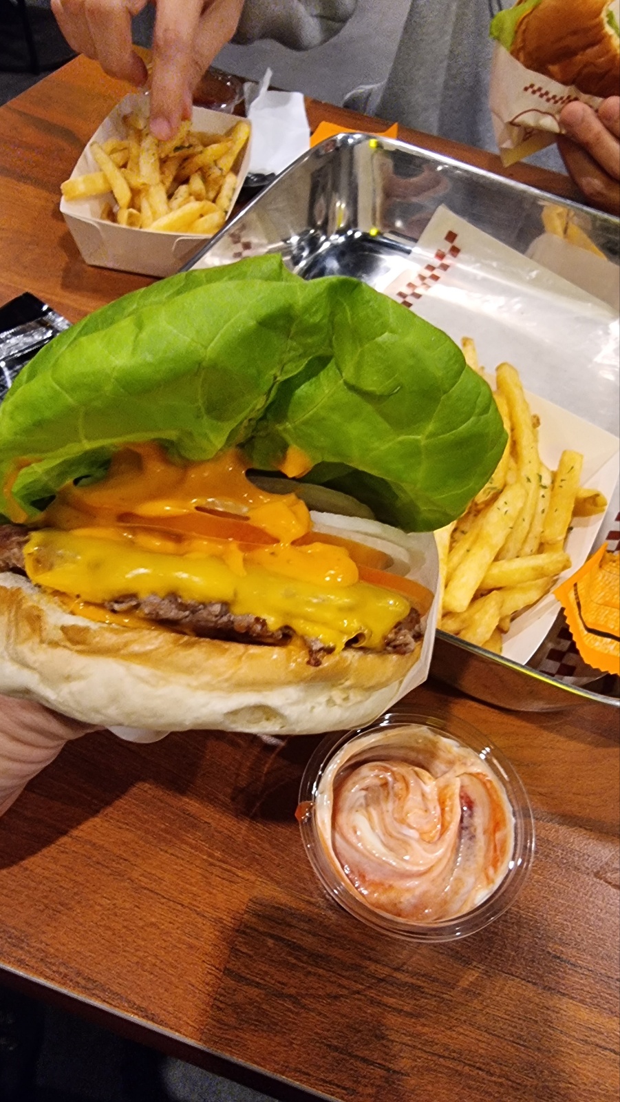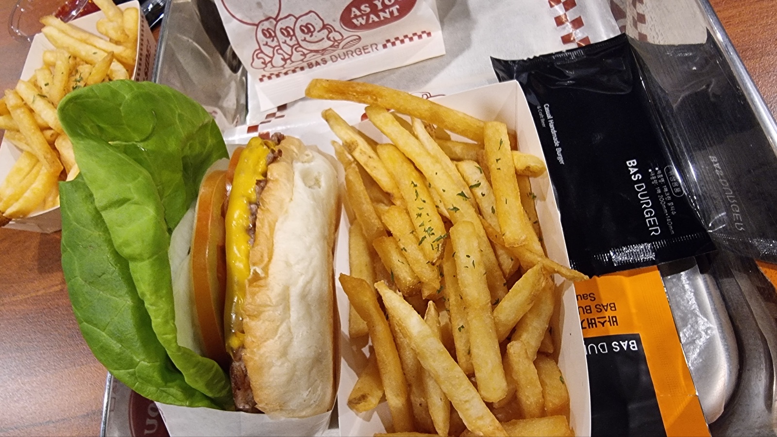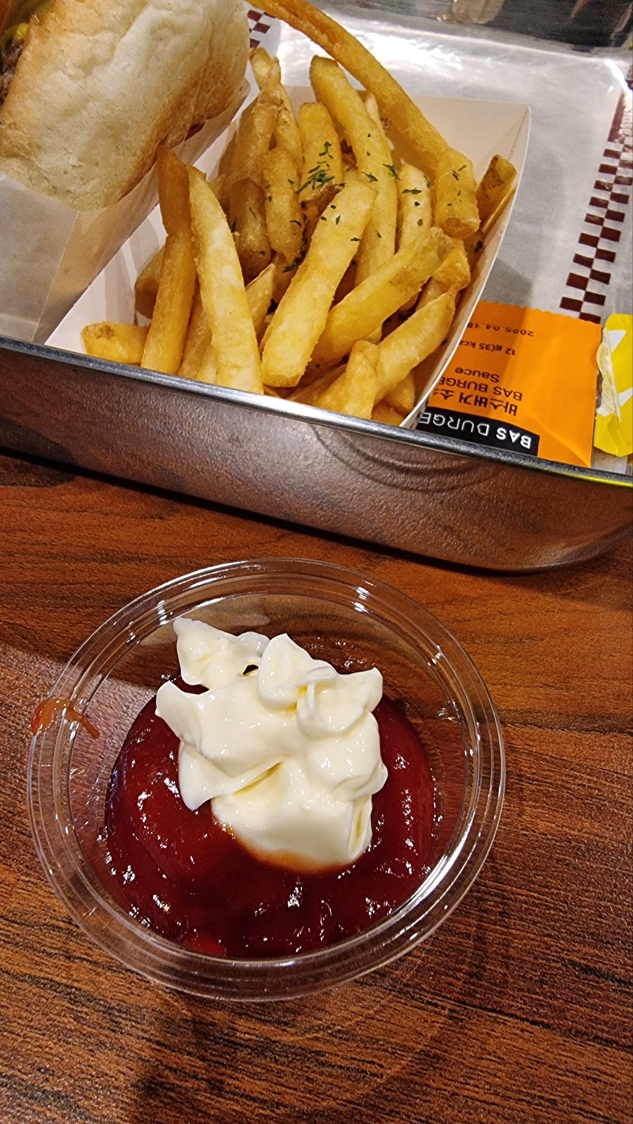 버거가 구워져 나오기 까지 대기 타면서, 캐첩과 마요네즈 취향껏 맘껏 섞어 찍먹 하는 고객체험 컨텐츠로 이해가 됩니다. 이거 은근 바스버거의 시그니처로 자동 기억됩니다.