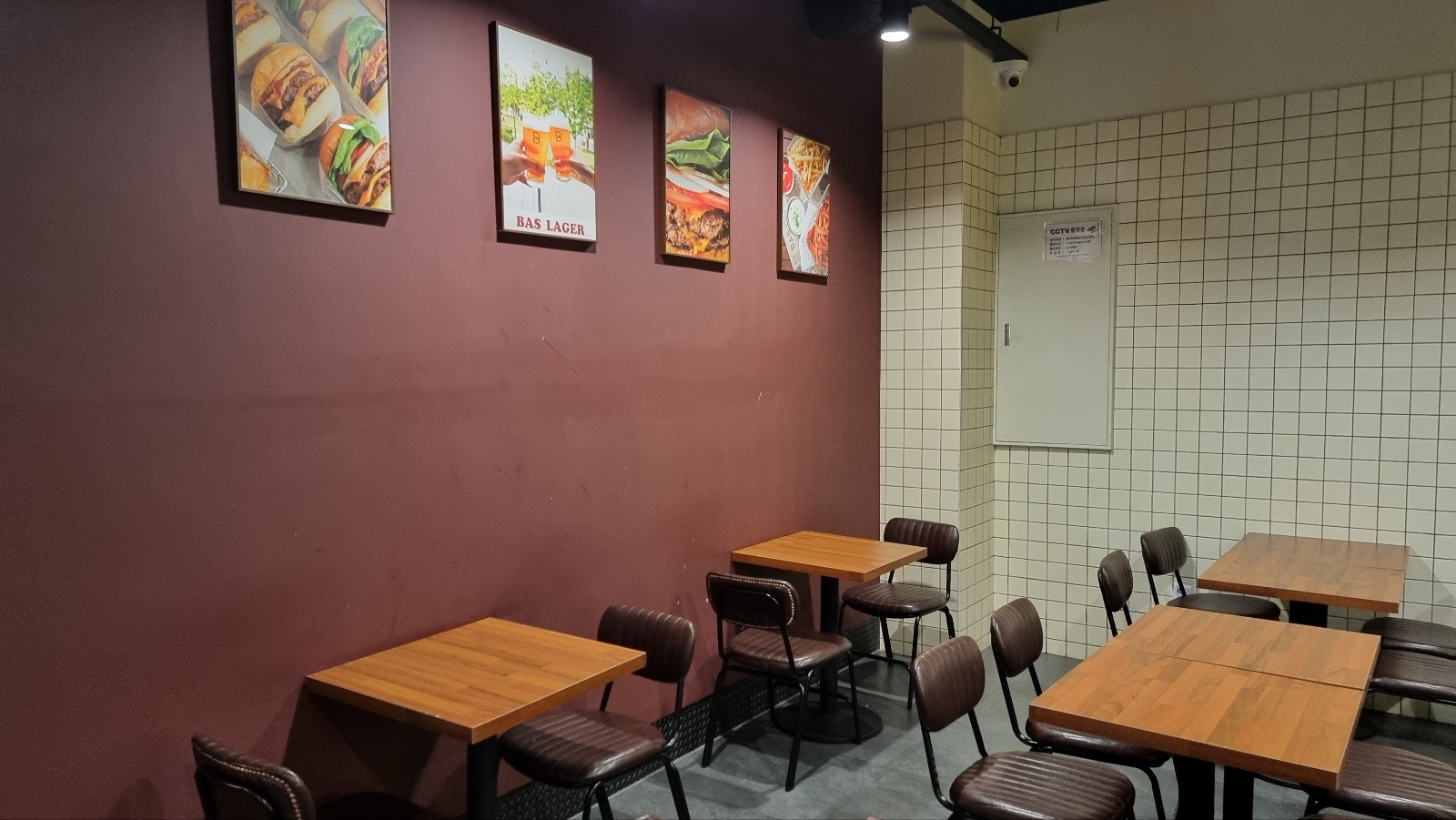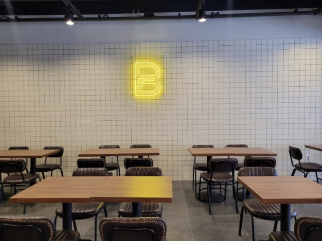 버거가 만들어져 나오는 키친 데스크가 정면에 크게 있고, 우측에 스탠드 전등이켜져 있는 곳에는 감자칩과 캐첩, 마요네즈 등이 준비되어 있는 곳입니다. 이곳에 준비되어 있는 감자칩이 바스버거라는 브랜드의 시그니처가 되어줍니다. 뒤에서 다시 소개할께요.