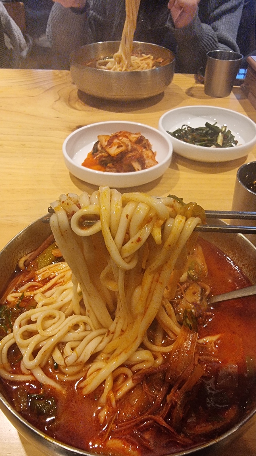 맞은 편에 앉아서 하얀 국물의 소사골 육수 칼국수를 먹는 동료들도 담백하기 그지 없다고 피드백을 줍니다. 아무리 그래봐도 저는 아직 젊어서 그런지 빨간 국물에 손이 먼저 가곤 합니다.